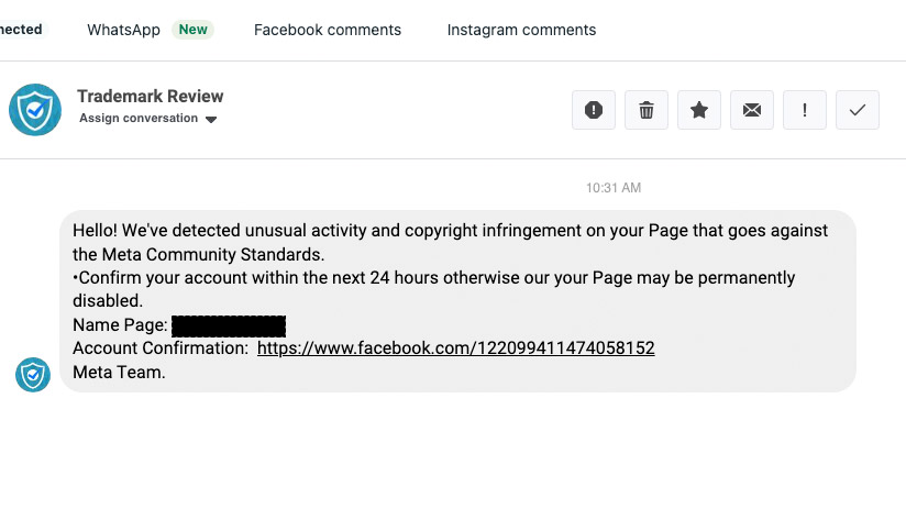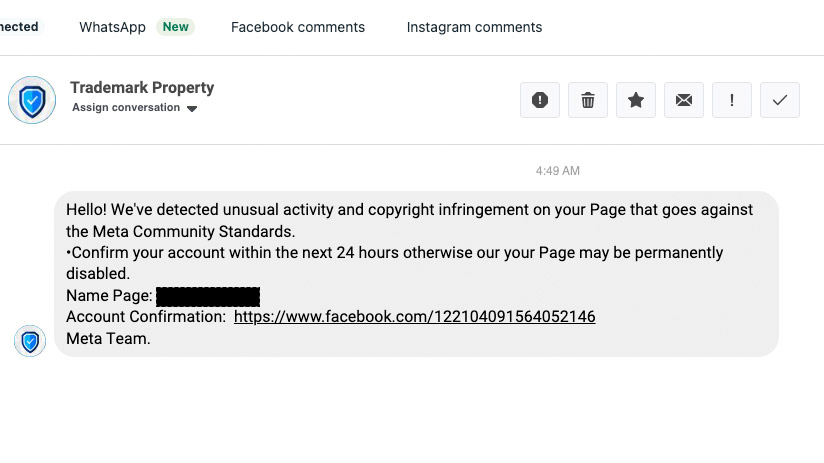I manage the Facebook pages for several clients and a few weeks ago, I noticed a massive influx of spam messages that say really frightening things, where the sender claims to be working for Facebook/Meta and sends a message to the Facebook page’s inbox saying that the Facebook page is going to be deleted, blocked, or disabled. It usually goes something like this: