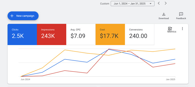 After 8 months, the client received nearly a quarter-million impressions, 179 phone calls, 240 conversions, 2,495 clicks, and over $250,000 in potential business, resulting in a ROAS (return on ad spend) of nearly 14.5.